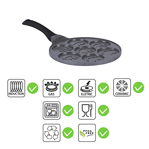 – [VERSALITA E COMODITA]: la piastra pancake di diametro 26 cm è ottima per cucinare uova o pancake; Si caratterizza per la presenza di 7 formine per realizzare i pancake, ciascuna con una differente emoticons; ottima per cotture su piani ad INDUZIONE; Adatto per cottura anche su piani a gas, vitroceramica e radianti