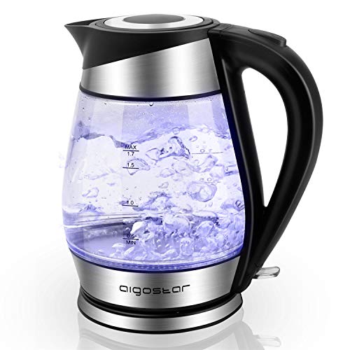 【Design unico】 Quando il LED blu si illumina, indica che il bollitore è in fase di riscaldamento. Con una capacità massima di 1,7 l, l’acqua raggiunge il punto di ebollizione in pochi minuti a seconda della quantità.