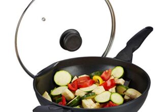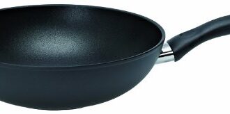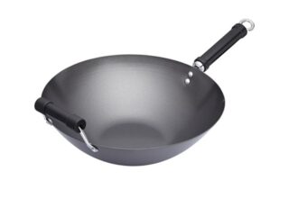 Wok da 28 cm con piccola base circolare e parte superiore ampia; adatto per la frittura al salto e per scottare i cibi, friggere, bollire, brasare, per la cottura a vapore e in liquido e molto altro