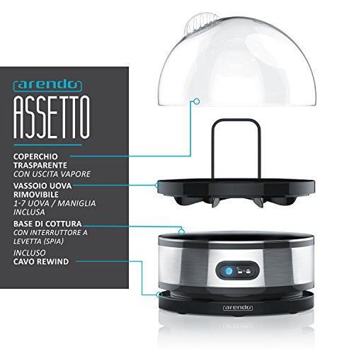 Dimensioni: diametro ca. 20cm x 18,5cm altezza | lunghezza del cavo: ca. 0,75m | peso: 769gr. / 661gr. (solo apparecchio) | colore: nero/argento (acciaio spazzolato antiruggine) | Dotazione: 1x bollitore per uova in acciaio Arendo Sevencook (con inserto per bollitore, coperchio trasparente con foro per la fuoriuscita del vapore, misurino + portauova)