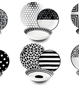 Servizio tavola 18 pezzi in porcellana; ideale per servire fino a 6 personeComposto da: 6 piatti piani diametro 24 cm. 6 piatti fondi diametro 20.5 cm. 6 piatti frutta diametro 19 cmColore: bianco e neroDecorazioni ...