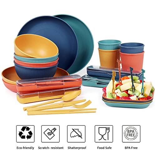 Il pacchetto include: questo set di stoviglie infrangibile include: 4 piatti per la cena, 4 piccoli piatti, 4 ciotole, 4 tazze, 4 coltelli da tavolo, 4 forchette, 4 cucchiai, 4 tacche e 4 scatole di stoccaggio.