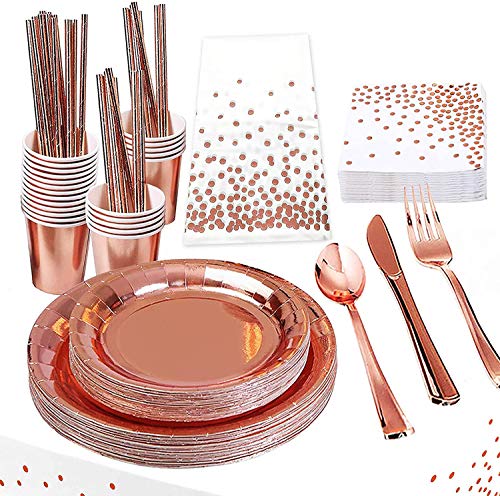 La confezione include – 193 pezzi Stoviglie per Feste set contiene 24 pezzi di piatti da 9 “, 24 pezzi di piatti da 7”, 24 pezzi di tazze, 24 pezzi di cannucce, 24 pezzi di tovaglioli, 24 pezzi di cucchiai, 24 pezzi di forchette, 24 pezzi di coltelli usa e getta, 1 pezzo di tovaglia. Set di stoviglie per feste per max 24 ospiti, decorazione da tavola molto bella per festa di compleanno in oro rosa.