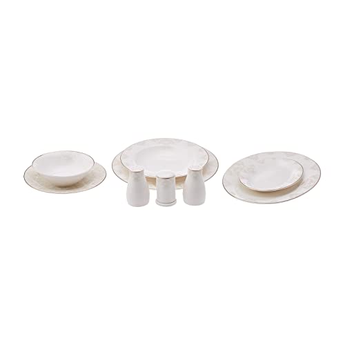 Che sono necessari per la progettazione di un tavolo da pranzo completo. Oltre ai piatti individuali per 12 persone, sono disponibili anche piatti e una saliera per il servizio al centro tavola. Presenta eleganti lavorazioni in oro su porcellana bianca. Sebbene queste opere rappresentino uno stile vintage, sono preferite per i tavoli da pranzo moderni nel loro insieme. Può essere lavato a mano o in lavastoviglie