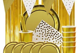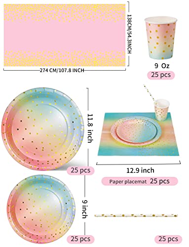 Nkaiso 126 Pezzi Arcobaleno Oro Stoviglie per Feste, Festa Decorazioni Set Include Piatti di Carta Tovaglioli Tazze di Carta Cannucce Tovaglia,per Nuziale Matrimonio,Compleanno -25 Ospiti