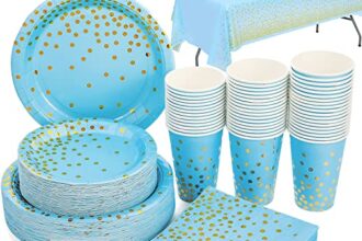 🍰【Misura del Servizio Perfetto】-126 pezzi di stoviglie di carta per compleanno, inclusi 25 piatti da 9 pollici, 25 piatti da 7 pollici, 25tovaglioli, 25 da Tazze, 25 da Cannucce e 1 Tovaglia.